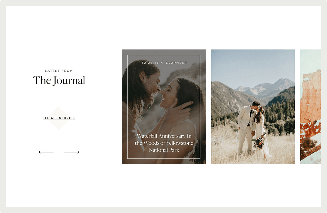 This element pulls a gallery with title, category, and a clickthrough link, allowing you to present your process, packages & offerings, as well as links to other pages and content on your site. Slider 13 works with landscape images.