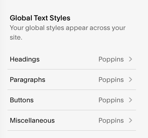 This is the easiest possibility: you just need to select a different Font Pack inside Site Styles and this will modify all the font settings automatically. If you prefer to select each font manually, first change fonts for the main elements in the Global Text Styles area: headings, paragraphs, buttons, and miscellaneous. These are the most important styles and will be carried on automatically to all elements across your site.